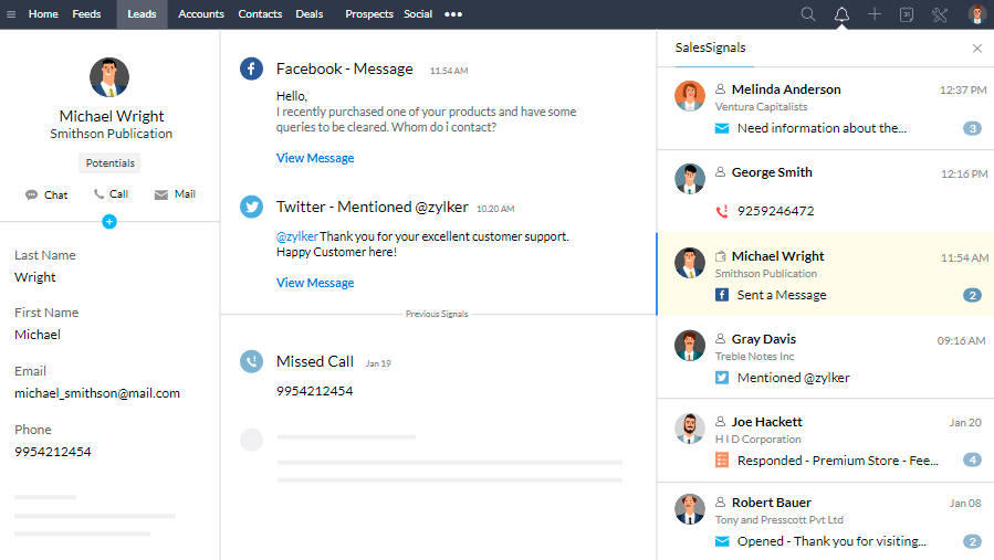 Zoho CRM allows you to connect with your customers through multiple channels, all while centralizing information that empowers your sales team to have contextual, meaningful conversations with your prospects.